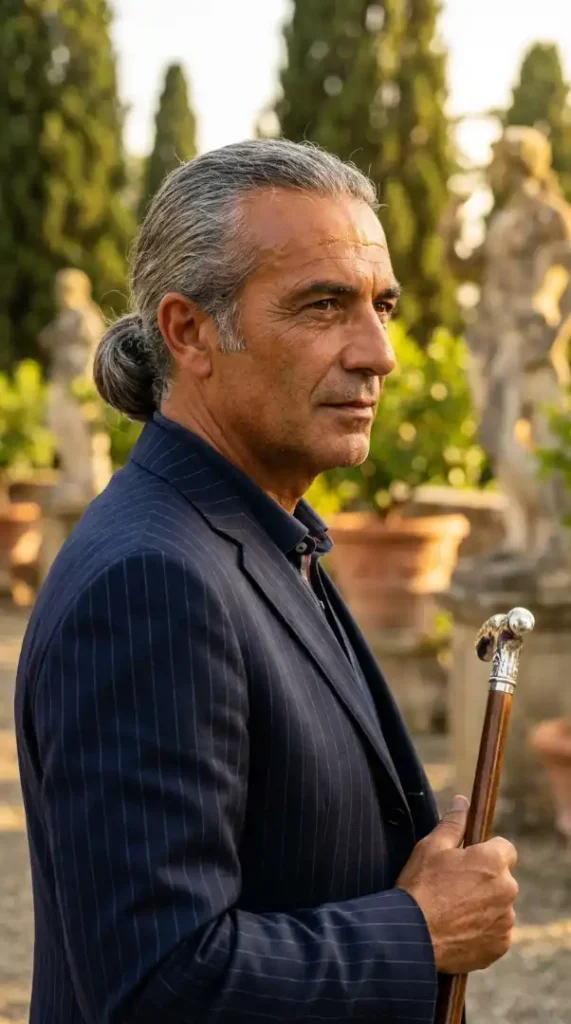 The Low Ponytail is the hallmark of the “Silver Fox” executive, offering a powerful, streamlined silhouette for formal business occasions. Face Shape Match: Square and Rectangular; the sleekness emphasizes a strong jawline. Grooming Kit: Boar Bristle Brush and a light-hold, high-shine Wax to keep flyaways at bay. Maintenance Level: Medium; requires high-quality conditioner to maintain the silver luster. The “Barber Talk”: “Request a ‘blunt cut’ at the very bottom of the length to ensure the ponytail looks thick and healthy, rather than wispy at the ends.”
