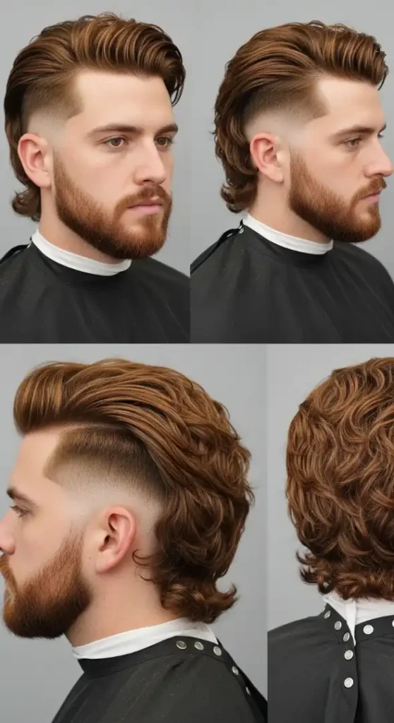 The Desert Storm Mullet is purpose-built for men with Heart and Diamond face shapes who also wear a full, dense beard. For Heart-shaped faces — wider at the forehead, narrower at the chin — the full beard is the great equalizer: it adds apparent width and mass to the lower face, counteracting the narrow chin and creating a balanced rectangular or oval silhouette. The pompadour-lifted top on a Heart face is a calculated move — rather than adding more forehead width (which you’d want to avoid), the lift goes vertical, adding height without width. For Diamond faces, the lifted crown adds height above the widest cheekbone zone, drawing the eye upward and making the proportionally narrower forehead appear more substantial. For Square faces, the full beard combined with the pompadour volume can create an overpowering effect — use this cut with a trimmed-down beard (under 1 inch) on Square faces to keep proportions balanced. This cut is NOT recommended for men who are prohibited from wearing beards in their work environment, as the beard is an integral design element — without it, the mullet-pompadour combination loses its architectural cohesion.