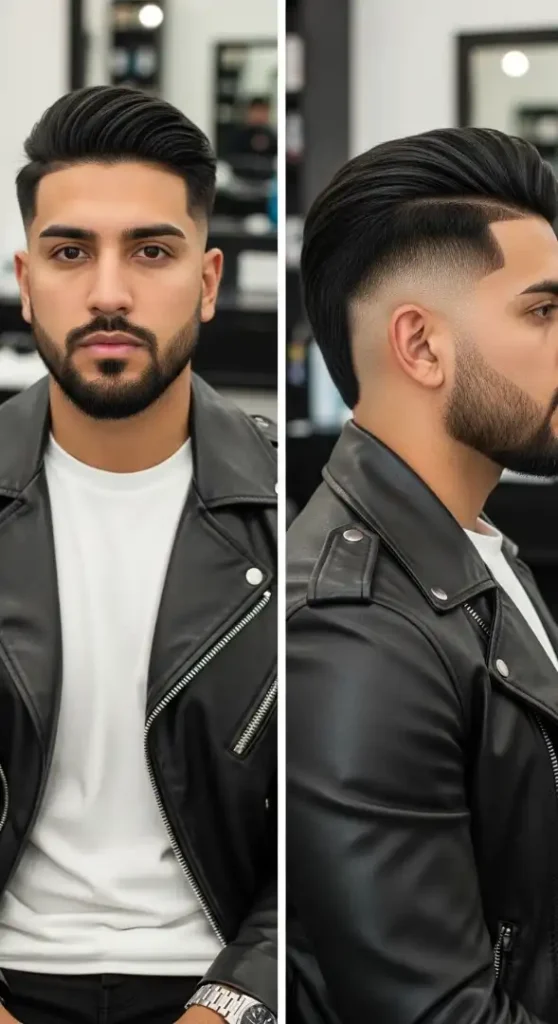 Products: Layrite Super Hold Pomade (hazelnut-sized amount) for the slicked-back top — gives glossy hold without stiffness; American Crew Defining Paste for the nape length texture; Beardbrand Gold Line Beard Oil for the low fade beard; Oribe Signature Shampoo for maintaining the jet-black shine.