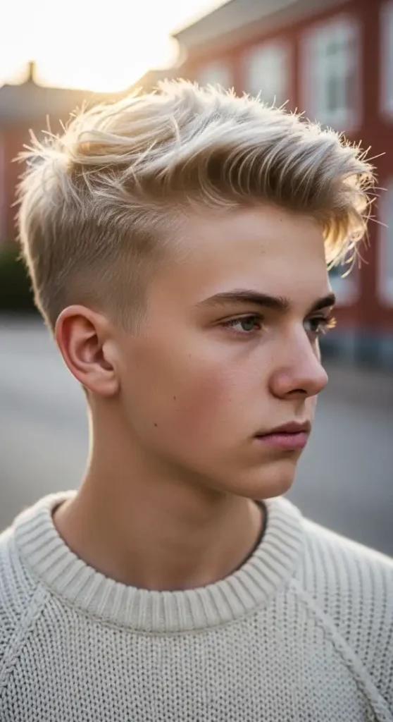 The British Mod Fringe is a blessing for fine hair because it completely covers the forehead, shifting the focus of hair density to the front. This is excellent for boys with high foreheads or hair that is thinning at the front. It looks very balanced on Oval and Long face shapes. For this, you’ll need a Boar bristle brush and dry shampoo to ensure the fringe doesn’t become oily. Maintenance is low to medium. Tell your barber: “I want a textured fringe that reaches the eyebrows, with a natural taper at the back.”