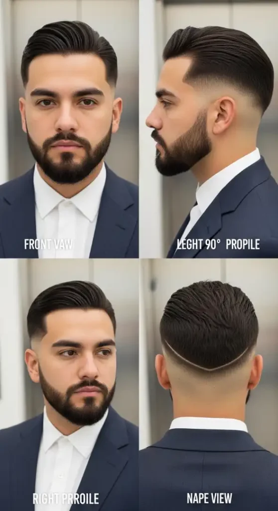 FACE SHAPE MATCH The Latin Kingmaker is the closing cut of this article — and it’s the definitive style for the Oblong face that leads with presence rather than subtlety. Where Style 5 (The Steel Precision) corrected the Oblong face through a flat French crop, The Latin Kingmaker takes the opposite approach: the textured quiff challenges the conventional “avoid height on an Oblong face” rule by using forward projection rather than upward projection. The quiff is swept forward and outward — not straight up — which adds apparent forehead breadth (horizontal line) rather than pure height (vertical line). The mid taper from mid-ear keeps the sides controlled and prevents the lateral width that an Oblong face doesn’t need. The 7mm contoured beard adds jaw width and definition at the face’s narrow base. This combination — forward quiff, controlled mid taper, contoured beard — creates an Oblong face that appears closer to Oval than elongated. This is not a suitable cut for men who travel frequently without styling products — the quiff requires daily rebuilding.